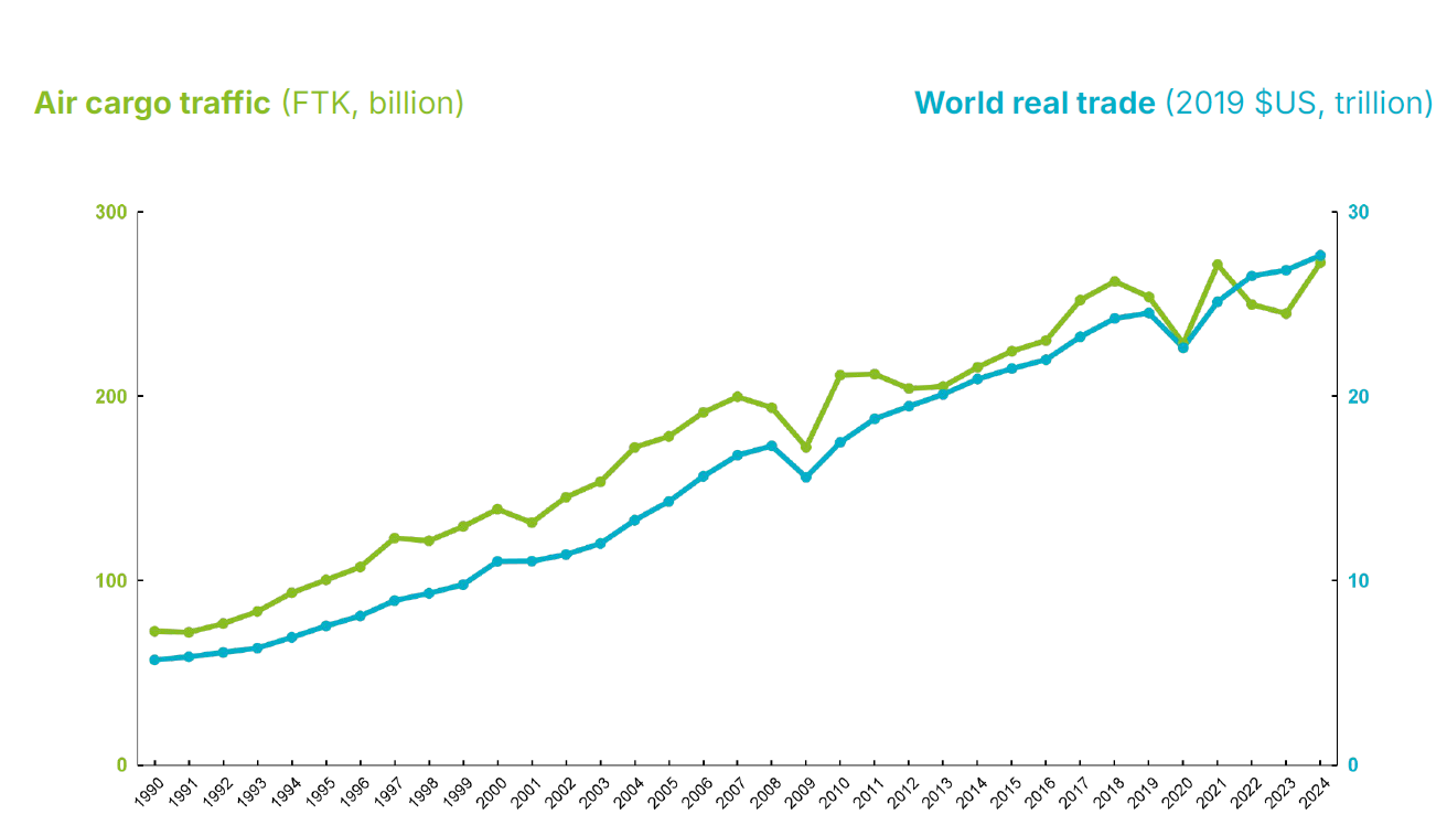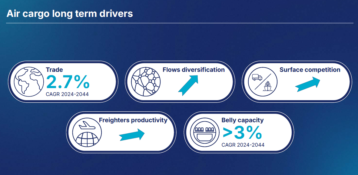 Tốc độ tăng trưởng kinh tế toàn cầu ở mức 2.7%/ năm, các luồng hàng phân bố đa dạng, có sự cạnh tranh tăng cao giữa các phương thức vận chuyển (tàu biển, tàu hàng không). Các tàu bay chở hàng càng ngày càng đạt được hiệu suất cao hơn nhờ vào ứng dụng công nghệ cải thiện kế hoạch chất xếp, và tốc độ tăng trưởng năng suất cho hàng hóa chở bằng bụng tàu bay cũng đạt mức trên 3%/ năm.