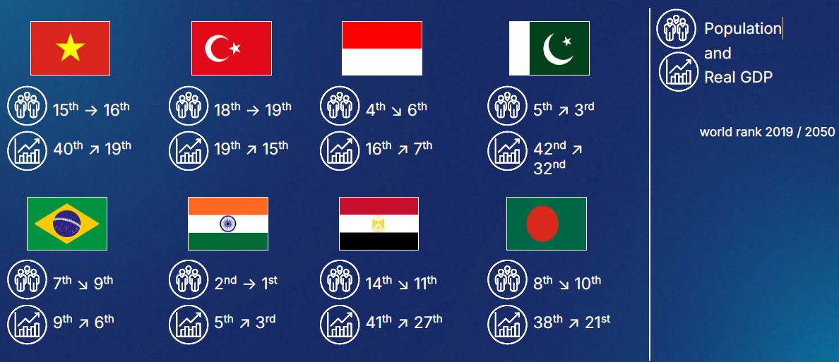Một số chỉ báo về xếp hạng dân số và GDP quốc gia trong thập kỉ sắp tới phải kể đến các nền kinh tế Ấn Độ, Indonesia, Việt Nam, Nigeria, Nam Phi, Brazil, … Đây đều là các quốc gia được đánh giá là động lực tăng trưởng kinh tế và Logistics quan trọng trên thế giới trong tương lai. Và Top 3 các tuyến hàng hóa bận rộn nhất thế giới vào năm 2045 sẽ là Châu Á – Thái Bình Dương & Bắc Mỹ/ Châu Á – Thái Bình Dương & Châu Âu, các tuyến Nội Á.