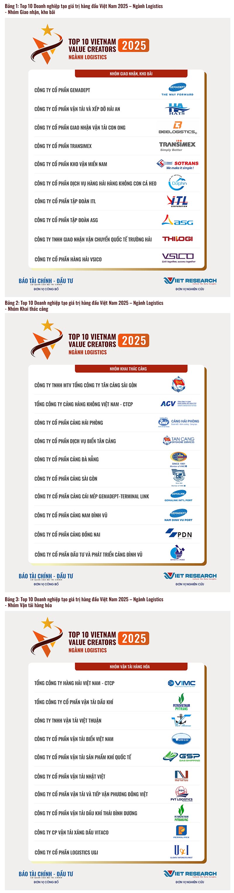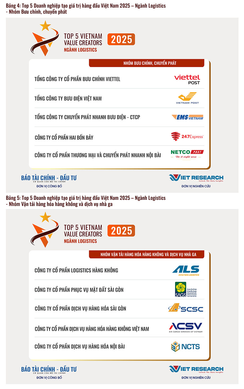 Tháng 10/2025, trong khuôn khổ Chương trình Nghiên cứu toàn quốc về các Doanh nghiệp tạo giá trị hàng đầu Việt Nam, Viet Research phối hợp với Báo Tài chính - Đầu tư (Bộ Tài chính) công bố Top 10 Doanh nghiệp tạo giá trị hàng đầu Việt Nam 2025 - Ngành Logistics.