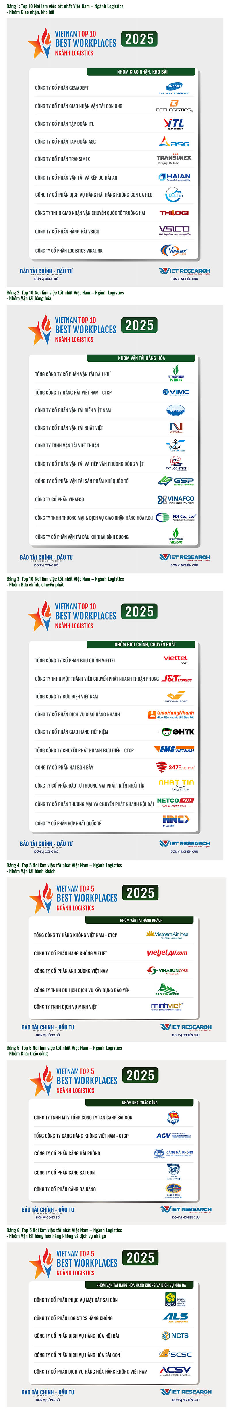 Năm 2025, Chương trình Top 10 Nơi làm việc tốt nhất Việt Nam - VBW10 trong các ngành kinh tế trọng điểm được Viet Research và Báo tài chính - Đầu tư (Bộ tài chính) nghiên cứu công bố danh sách các nơi làm việc tốt nhất tại Việt Nam, công bố Bảng xếp hạng toàn quốc và Bảng xếp hạng theo Ngành. Các lĩnh vực được đánh giá bao gồm: Năng lượng – Dầu khí, Ngân hàng – Tài chính, Công nghệ - Viễn thông, Logistics, Thực phẩm - Đồ uống, Bất động sản, ....