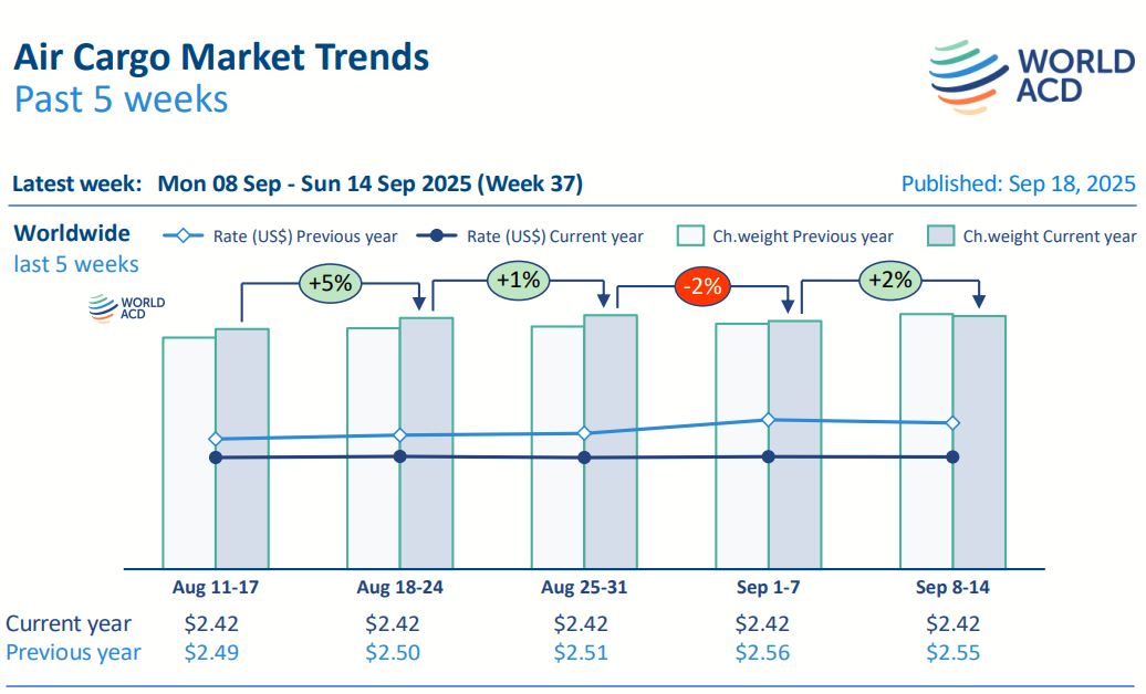 Theo số liệu và phân tích mới nhất từ WorldACD Market Data, khối lượng hàng hóa tính cước (chargeable weight) từ Ấn Độ sang Mỹ tiếp tục giảm -8% so với tuần trước (WoW) trong tuần 37 (8–14/9), sau khi đã giảm -12% và -11% ở hai tuần trước đó. Những mức sụt giảm này nối tiếp sau đợt tăng đột biến +28% ở tuần 34, khi các chủ hàng gấp rút vận chuyển trước thời điểm Mỹ áp mức thuế “đáp trả” 50% từ ngày 27/8 đối với hàng nhập khẩu từ Ấn Độ.