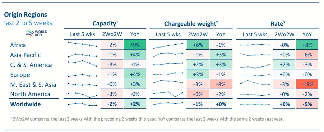 Trên phạm vi toàn cầu, sản lượng hàng không tăng +2% WoW trong tuần 37. Mặc dù sản lượng từ khu vực MESA giảm -4% WoW, nhưng đã được bù đắp bởi sự phục hồi mạnh từ Bắc Mỹ (+11% WoW) sau kỳ nghỉ Labor Day (1/9) tại Mỹ, cùng với mức tăng từ châu Á – Thái Bình Dương (+2% WoW).