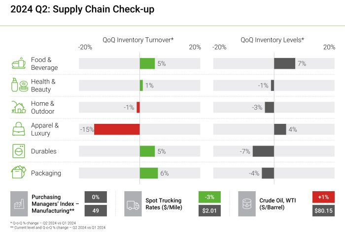 Prior to the recently announced interest rate cut, the consumer products (CP) industry has exhibited mixed results across the supply chain. Apparel and Home sectors both saw declining quarter-over-quarter (QoQ) inventory turnover (-15% and -1%, respectively), as consumers continued to deprioritize discretionary purchases.