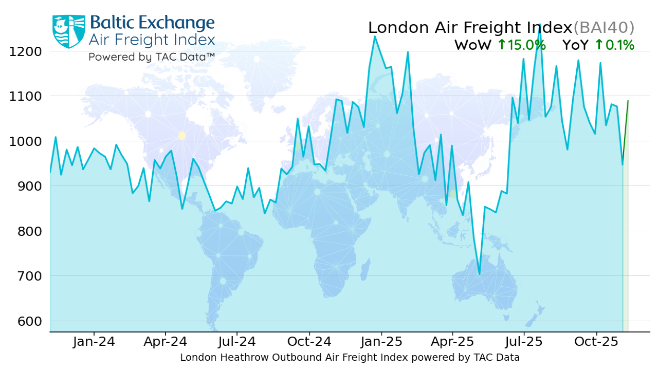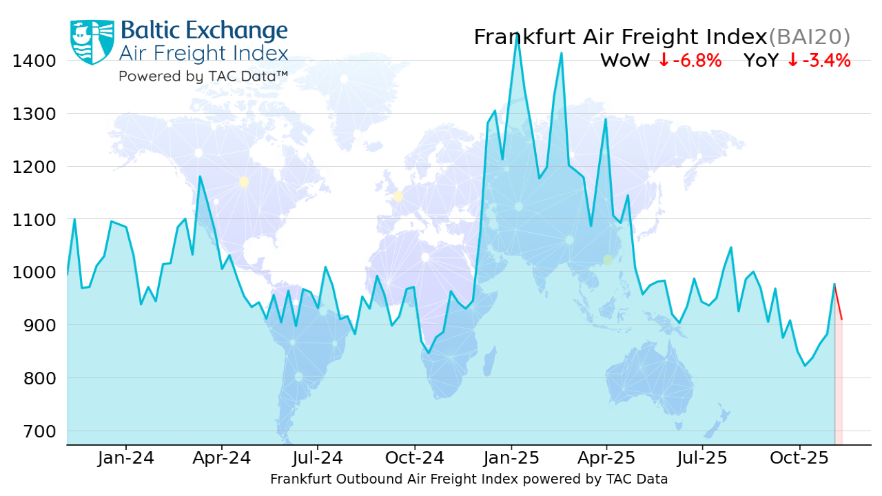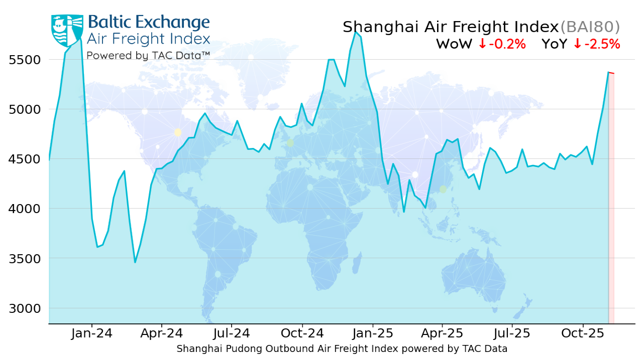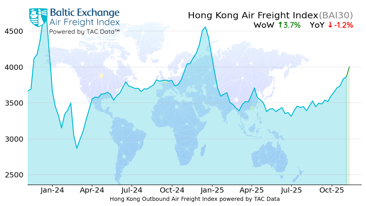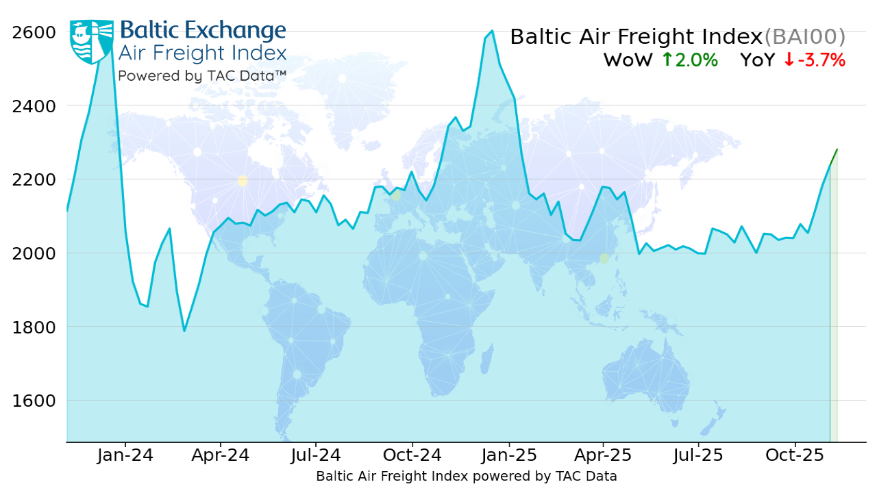 Airfreight rates rose again last week according to the latest data from TAC Index, the leading price reporting agency on air freight markets. The global Baltic Air Freight (BAI00) calculated by TAC gained another plus two percent in the week to November 10, leaving it lower by only minus three point seven percent from 12 months earlier. Sources were viewing this as unexceptional for a period when the market enters the height of peak season, though that was before the fatal crash of a UPS cargo plane in Louisville, which has prompted the grounding of all MD-11 cargo planes operated by FedEx and Western Global as well as UPS. Sources suggest this could have a significant effect on capacity in the coming days, particularly on Transpacific routes, where the majority of MD-11 freighters operate, and could impact rates in the coming days.
