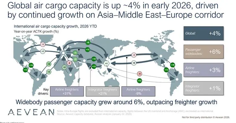 Data from analyst and consultant Aevean show that global air cargo capacity rose by 4% year on year between 1 January and 22 January.