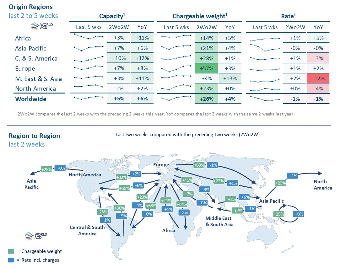 Compared with the previous week, average global rates are slowly picking up again after bottoming out in week 2, edging up by a further +2%, WoW, to US$2.43 per kilo – although that WoW recovery in rates is slightly slower than last year, most likely due to the aforementioned +6% YoY capacity rebound.