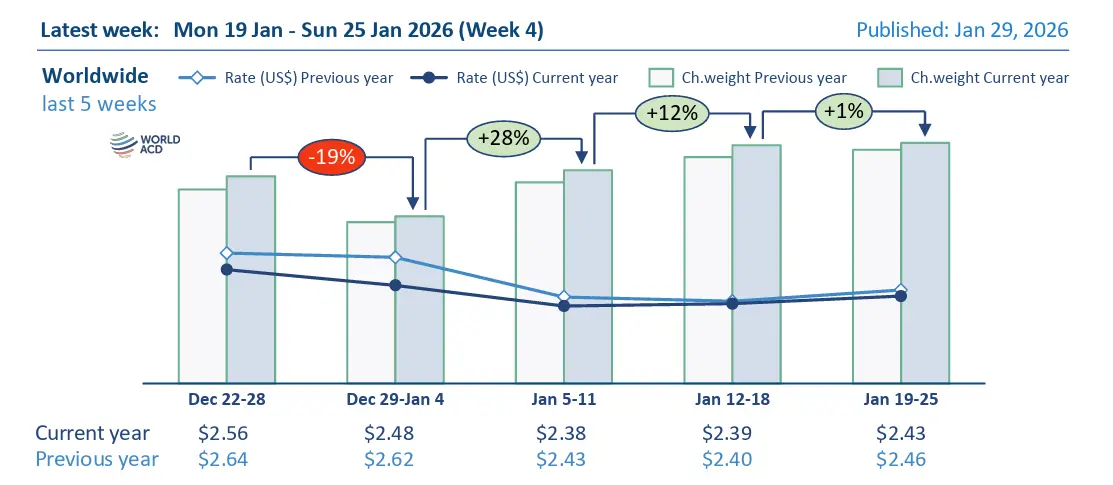Global air cargo demand and prices have broadly stabilized in the third full week of 2026 after completing their recovery from the annual end-of-year slump, ahead of a brief expected further uplift in demand from Asia Pacific origins prior to the Lunar New Year (LNY) period in the second half of February, according to the latest weekly figures and analysis from WorldACD Market Data.