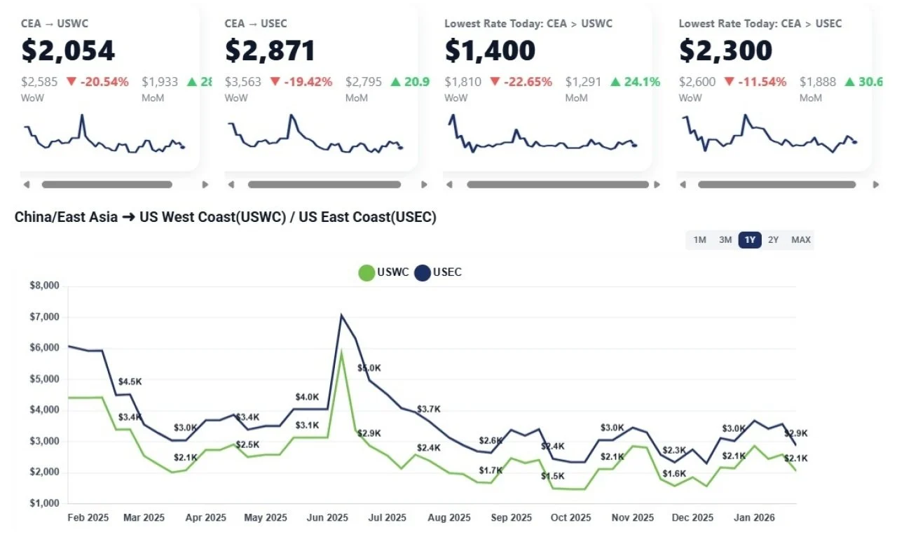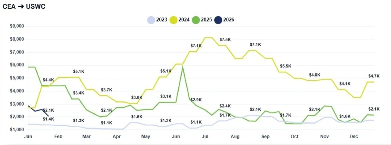 CEA to USWC: Rates have dropped further than anticipated, currently sitting between $1,600 and $1,650 per container. This represents a significant decline and places pricing at levels reminiscent of November 2025.