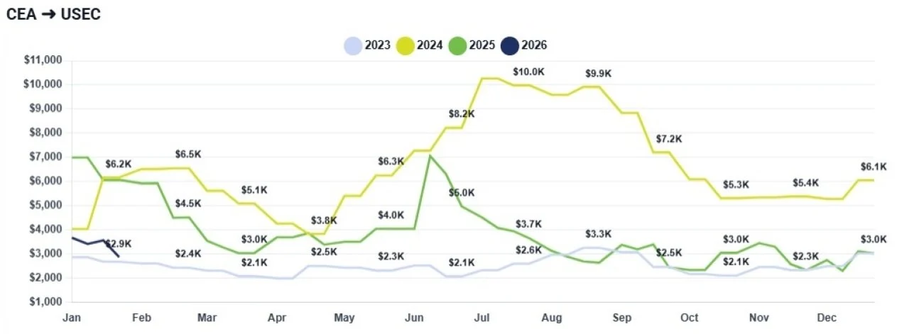 CEA to USEC: Rates to the East Coast, including JFK, have also climbed steadily. After hovering around $4.59-$4.89 per kilogram in Week 3, prices have now pushed into the $5.18-$5.48 per kilogram range. This reflects a more moderate but consistent increase of roughly 60 cents per kilogram compared to the prior week.