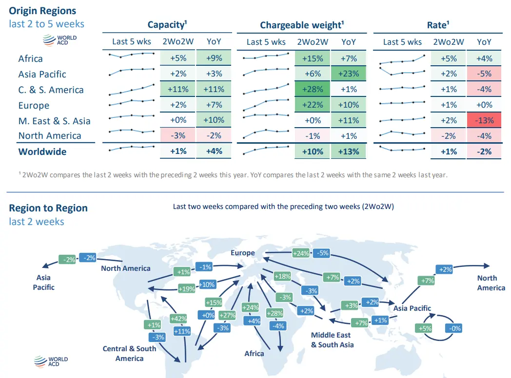 More broadly on the pricing side, average worldwide full-market rates in week 5 of US$2.42 per kilo were around +1% higher, WoW, and -2% below their level in week 5 last year, based on a mix of spot and contract rates. Meanwhile, average global spot rates in week 5 of US$2.68 per kilo were up +2%, WoW, and broadly the same as in week 5 last year.