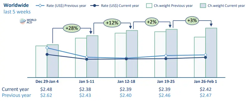Full-month average worldwide spot rates in January 2026 of $2.65 per kilo were -8% lower compared with December, and were down -1%, year on year.