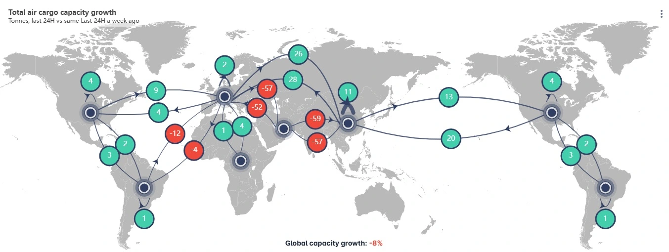 Figures from consultancy Rotate show that global cargo capacity is down by around 8% in the last 24 hours compared with a week ago. However, this is an improvement on the 18% decline recorded at the start of the week.