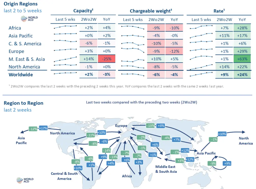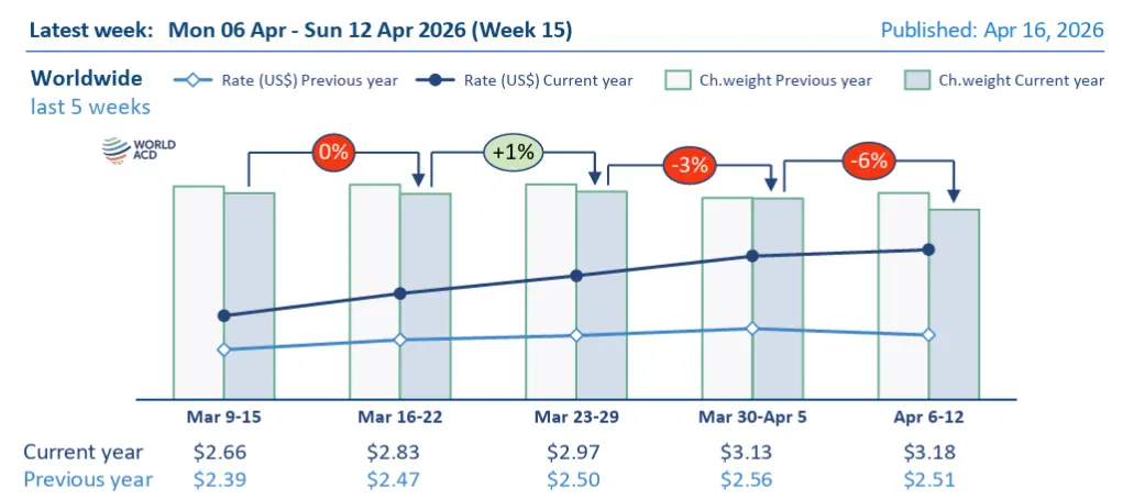 According to the latest weekly figures from WorldACD Market Data, average worldwide spot rates rose by a further +3% in week 15 (6 to 12 April) to US$3.76 per kilo, taking them +37% higher than this time last year and more than +40% up compared with their level at the end of February, when the US and Israel launched military strikes on Iran.
