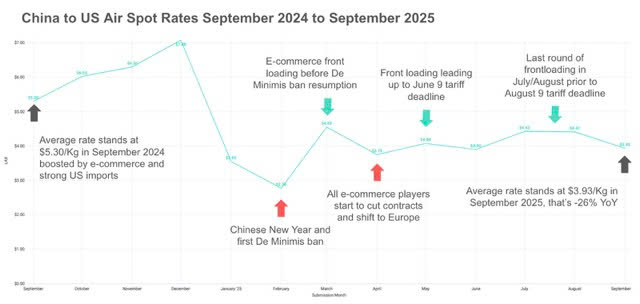 "The decrease in de minimis effectively took 5% of global demand out of the market. However, there are demand events that will still drive a peak: e-commerce from Asia to Europe is still growing and taking capacity, and so are the Apple launch and other seasonal product launches.