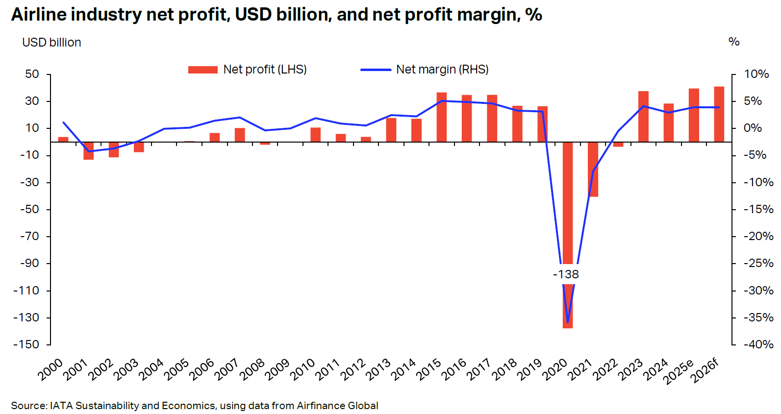 Airlines are projected to deliver a combined net profit of USD 41 billion in 2026, up from USD 39.5 billion in 2025. This would mark a new record for the industry. Yet, the net profit margin remains unchanged at 3.9%.