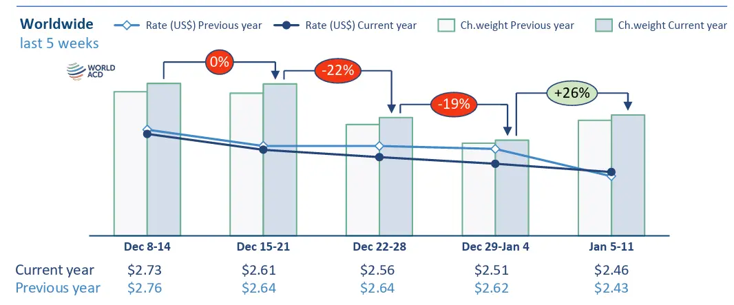 Average worldwide rates slipped downwards by a further -2%, WoW, to US$2.46 per kilo. That’s around -10% below their average level in mid-December, but it’s slightly above (+1%) the $2.43 full-market average rate this time last year.