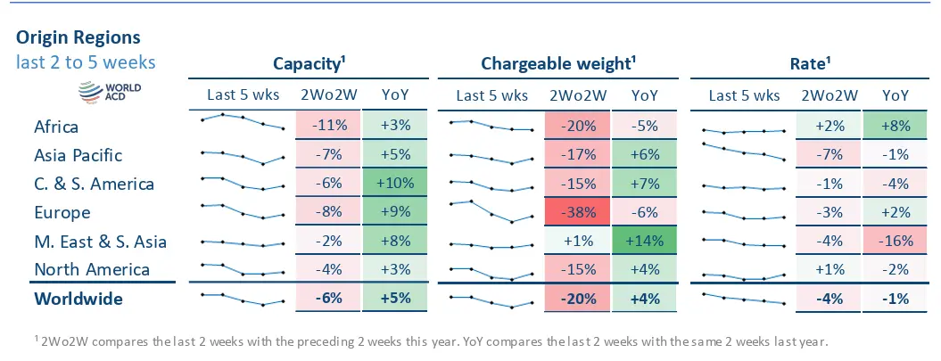 Worldwide air cargo tonnages in week 2 recorded a +26% week-on-week (WoW) rebound, following consecutive steep weekly drops of -22% and -19% at the end of last year, leaving worldwide tonnages still -20% below their mid-December levels, based on the more than 500,000 weekly transactions covered by WorldACD’s data. The strong rebound in week 2 can be seen across all origin regions except for Africa.