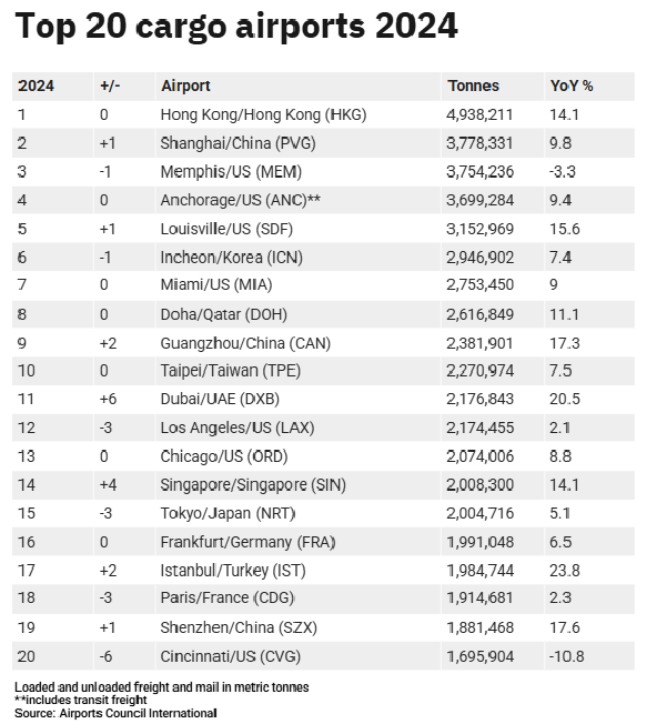 The top 20 cargo hubs handled 52.2m tonnes last year, up 9% from 2023 and 10.8% above pre-pandemic levels.