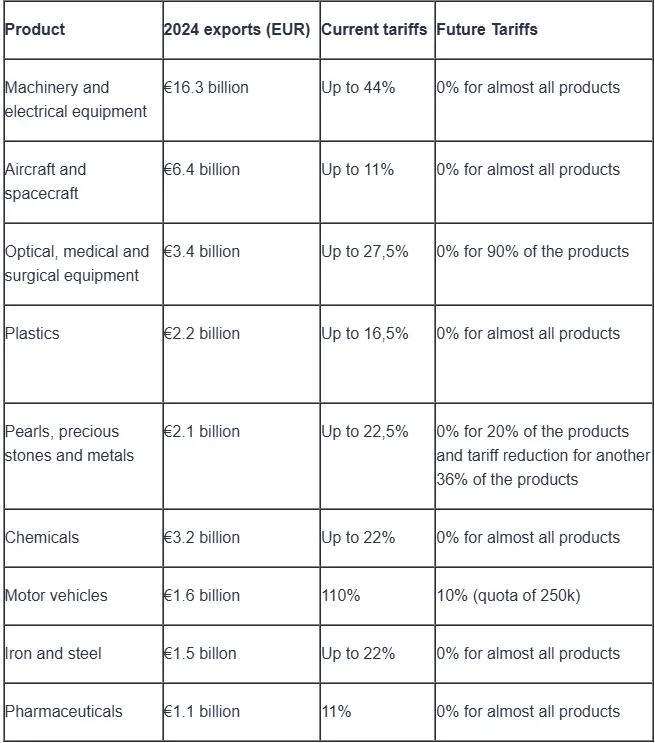 India will reduce its tariffs on EU-made cars from 110% to 10%, and they will be abolished for car parts after five to ten years. Tariffs ranging up to 44% on machinery, 22% on chemicals, and 11% on pharmaceuticals will also be mostly eliminated.