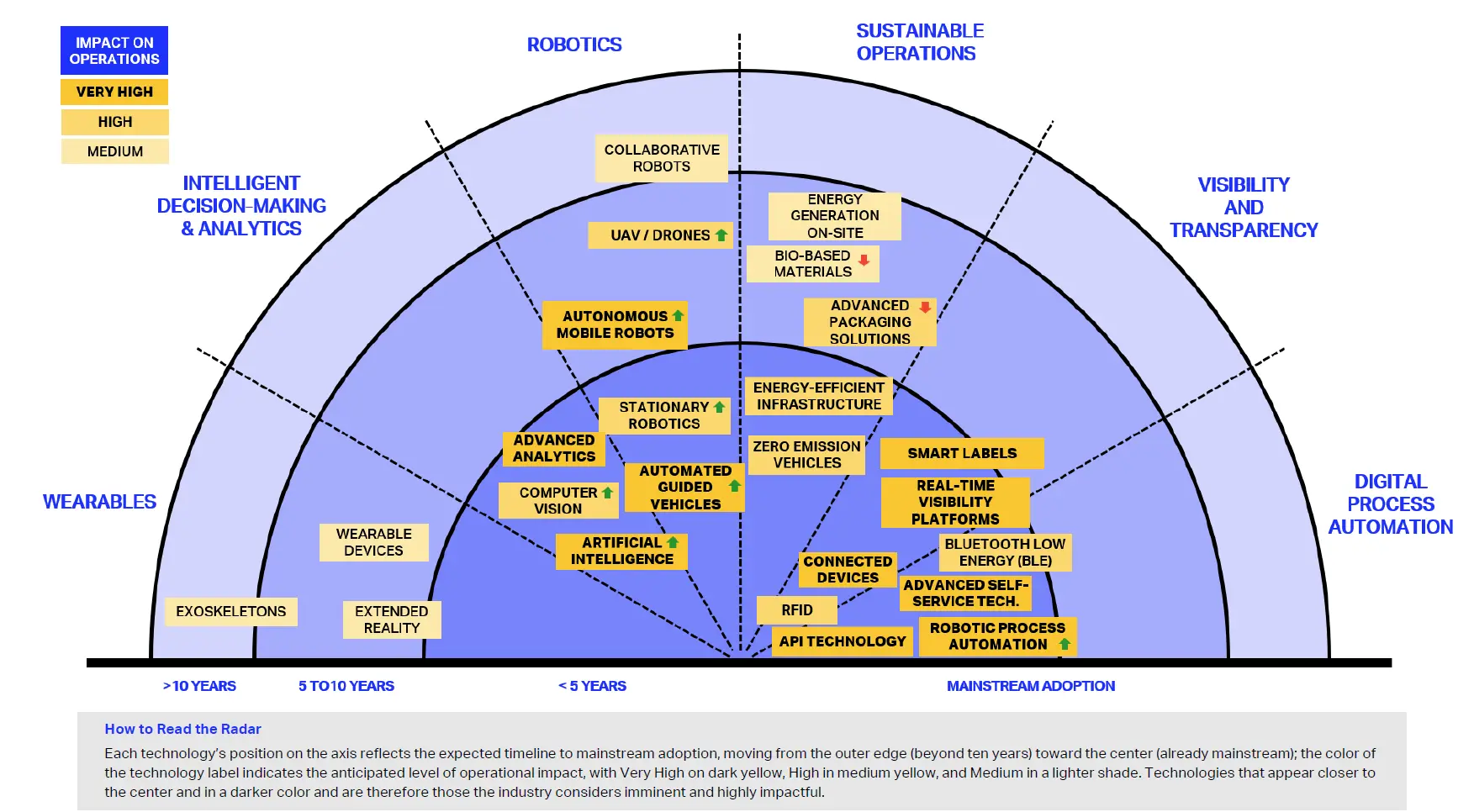 Khả năng hiển thị thời gian thực (Real-time visibility) là nhóm công nghệ đạt hiệu suất đồng đều nhất với 100% các giải pháp (RFID, Bluetooth Low Energy, cảm biến IoT) dự kiến sẽ trở nên phổ biến trong vòng dưới 5 năm. Về mặt bền vững, các hạ tầng tiết kiệm năng lượng và phương tiện không phát thải đang được ưu tiên đầu tư không chỉ vì áp lực pháp lý mà còn do tính hiệu quả về chi phí trong dài hạn.